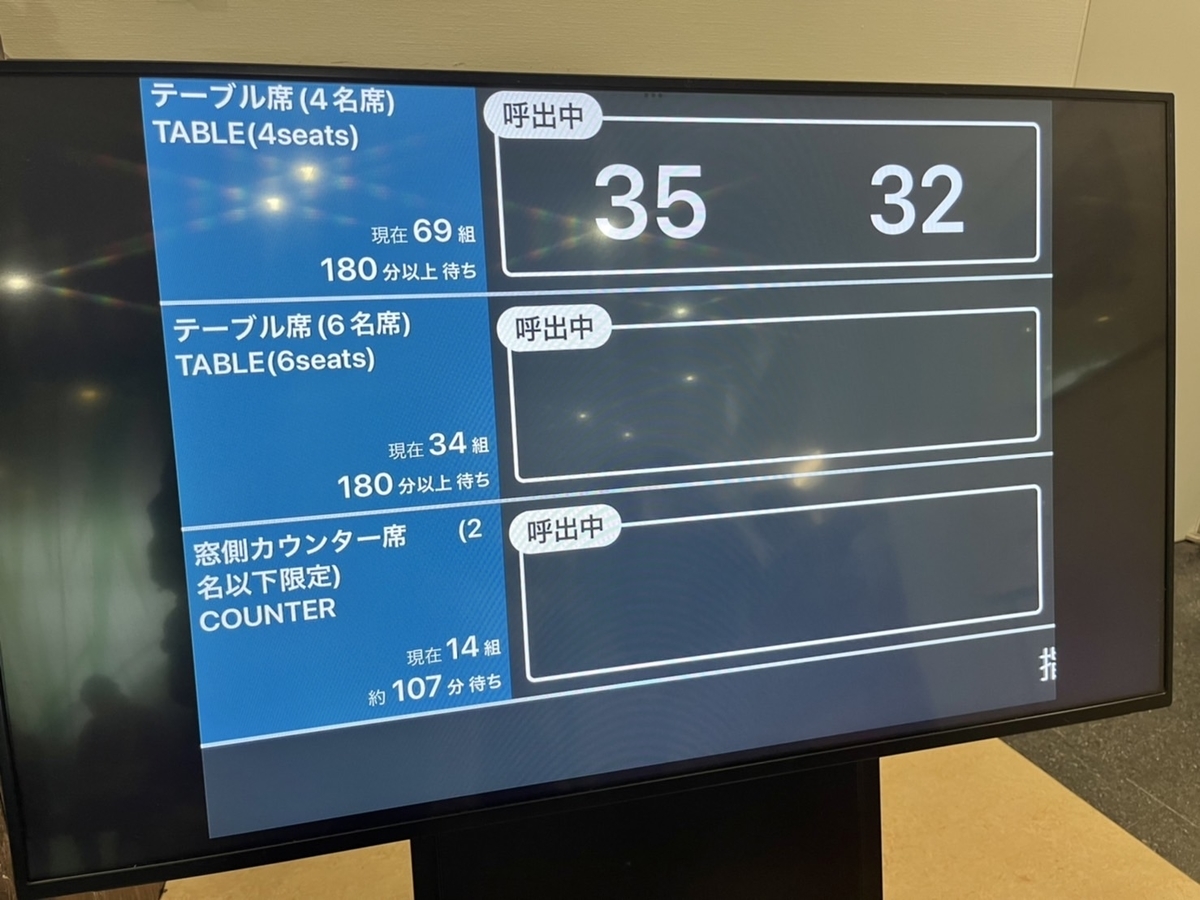 こんな感じでテーブル席はもはや終了、2名以下のカウンター席でも2時間弱待つ感じでした。