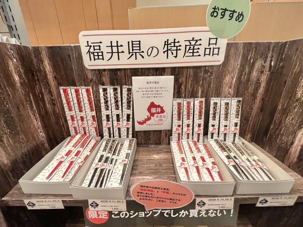 グッズを見に行くと、恐竜柄のお箸がありました。なんでも福井県の特産品とのこと。