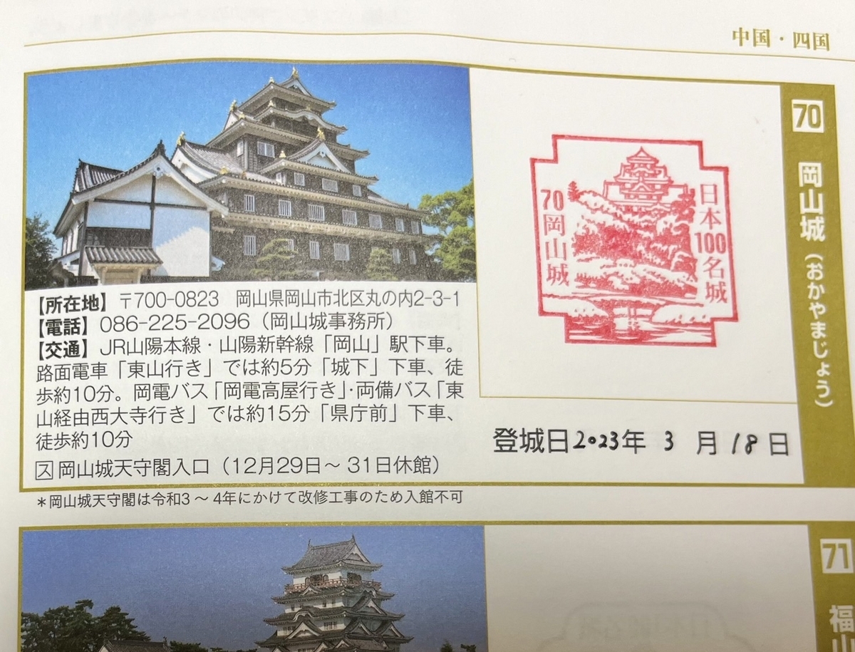 岡山城、丸亀城ともに「日本100名城」の一つということで、ちまちまとスタンプを集めています。