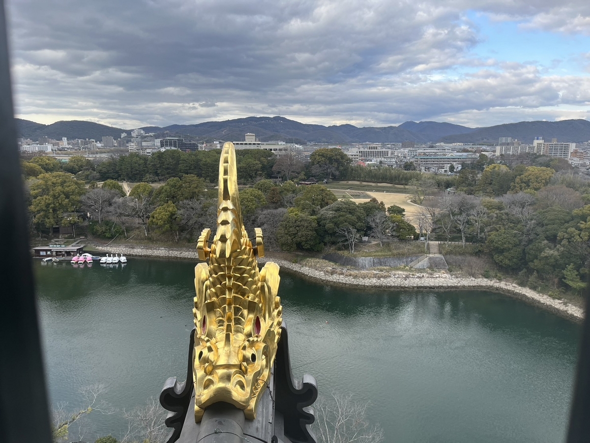 上に登ってみると向こうには後楽園、手前には金色のシャチホコ?が見えました。